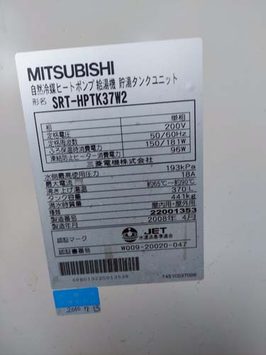 三島市栄町 三菱電機自然冷媒ヒートポンプ給湯機 貯湯タンクユニットSRT-HPTK37W2→コロナ自然冷媒CO2家庭用ヒートポンプ給湯機 ヒートポンプユニットCHP-DZ451K エコキュート交換工事