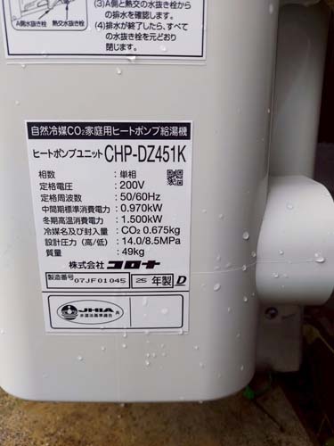 三島市栄町 コロナ自然冷媒CO2家庭用ヒートポンプ給湯機 ヒートポンプユニットCHP-DZ451K エコキュート交換工事